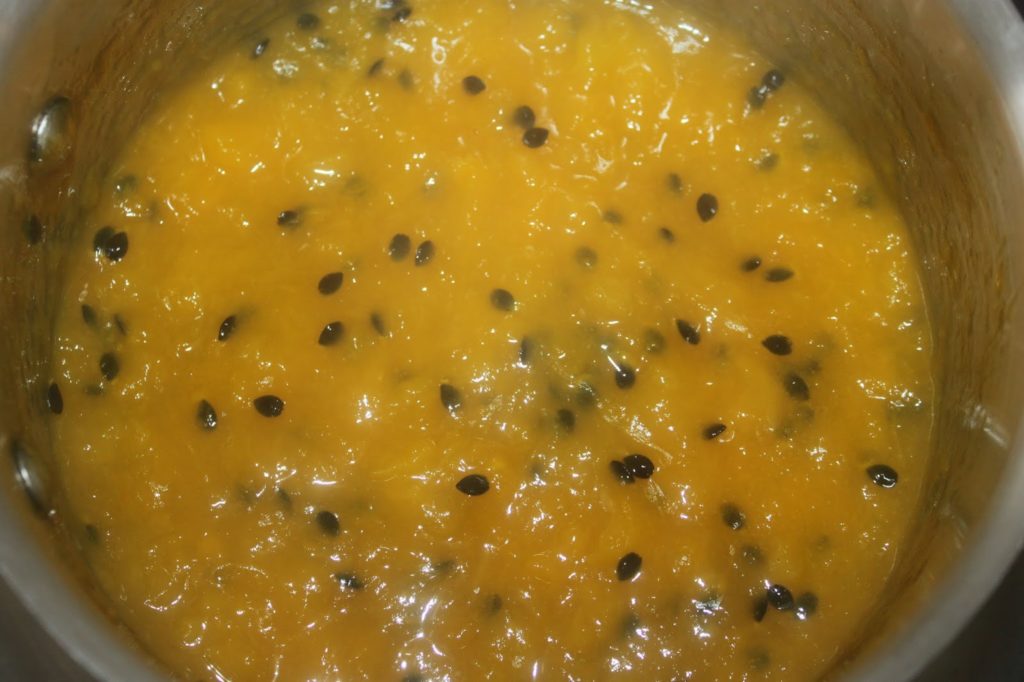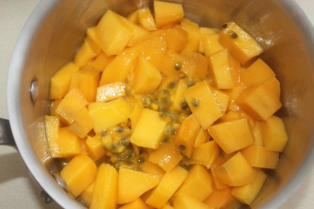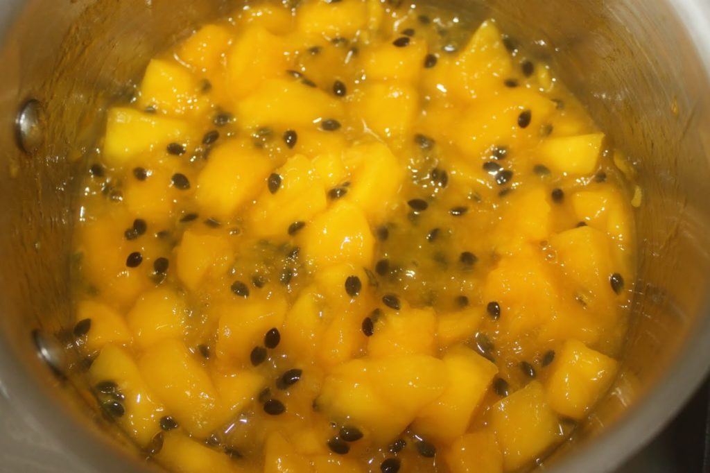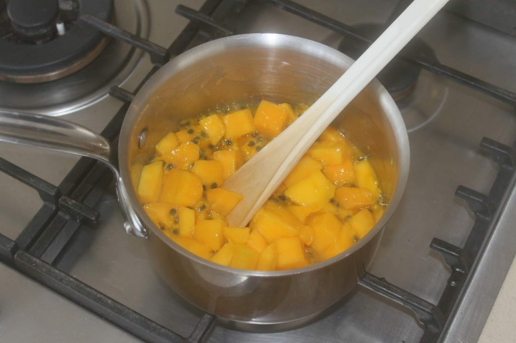 - Vous pouvez ajouter un peu d’eau pour avoir la consistance désirée. J’ai également ici écraser la mangue à la fourchette. Laissez ensuite refroidir.