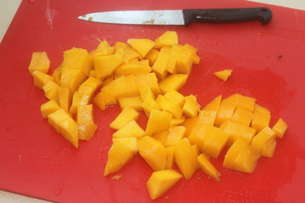 - Pour le coulis, épluchez et coupez en morceaux la mangue.