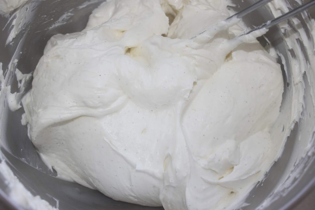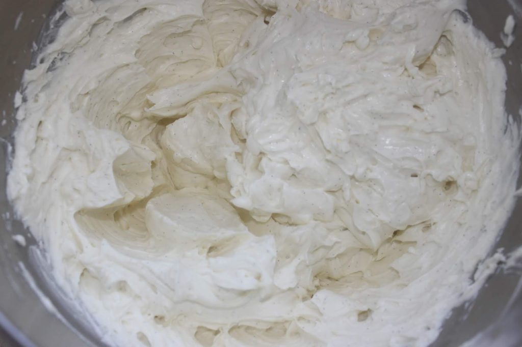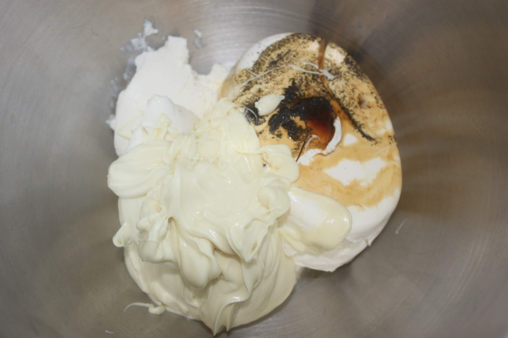 Versez le cream cheese, le sucre (15g), le chocolat blanc fondu, la vanille liquide et l’intérieur de la gousse, le zeste du demi-citron. Mélangez avec le feuille de votre robot ou avec une spatule.