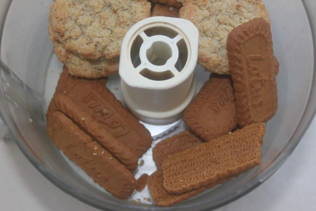 - Placez les biscuits dans votre mixeur. J’ai pris ici moitié biscuits avoine et moitié spéculos.