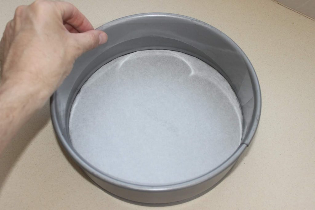 - Chemisez votre moule à manqué à bord amovible dans le fond. J’ai mis également un morceau de rhodoïd dans le bord intérieur du moule. Cela va permettre de démouler très facilement le gâteau.