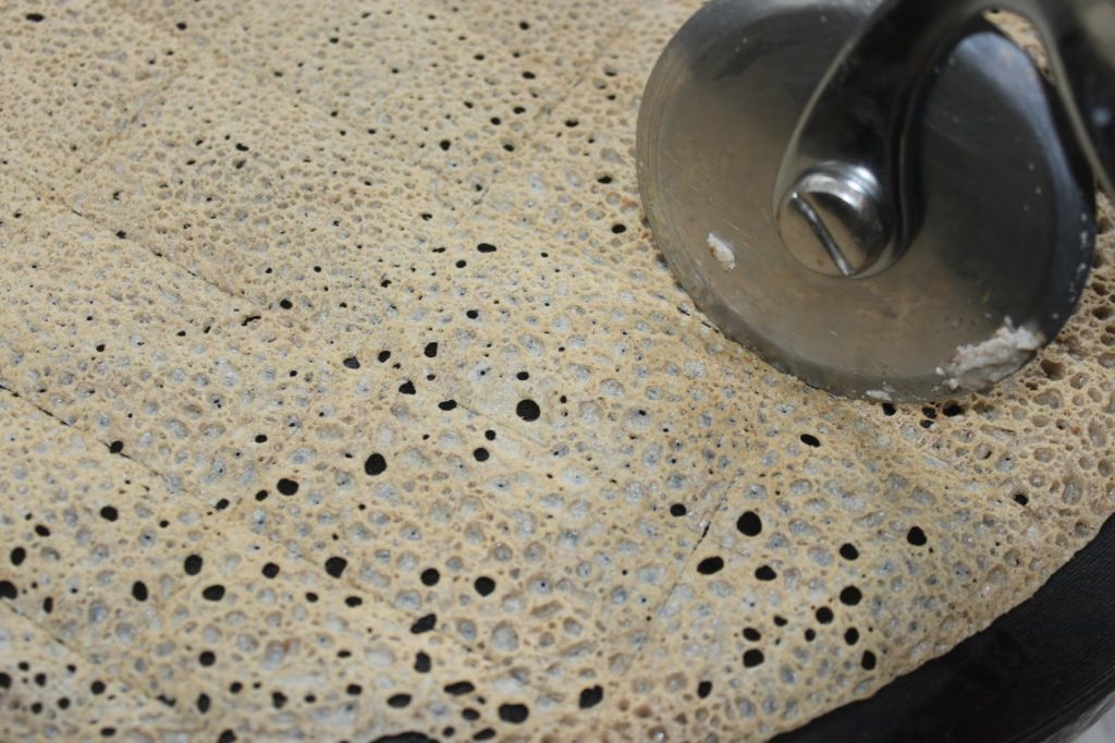 Quand le dessous est cuit, retournez la crêpe réalisée puis coupez-la en morceaux tout de suite. N’attendez pas avant de couper, car après la crêpe devient cassante. Les chips vont commencer à grésiller grâce à l’huile.