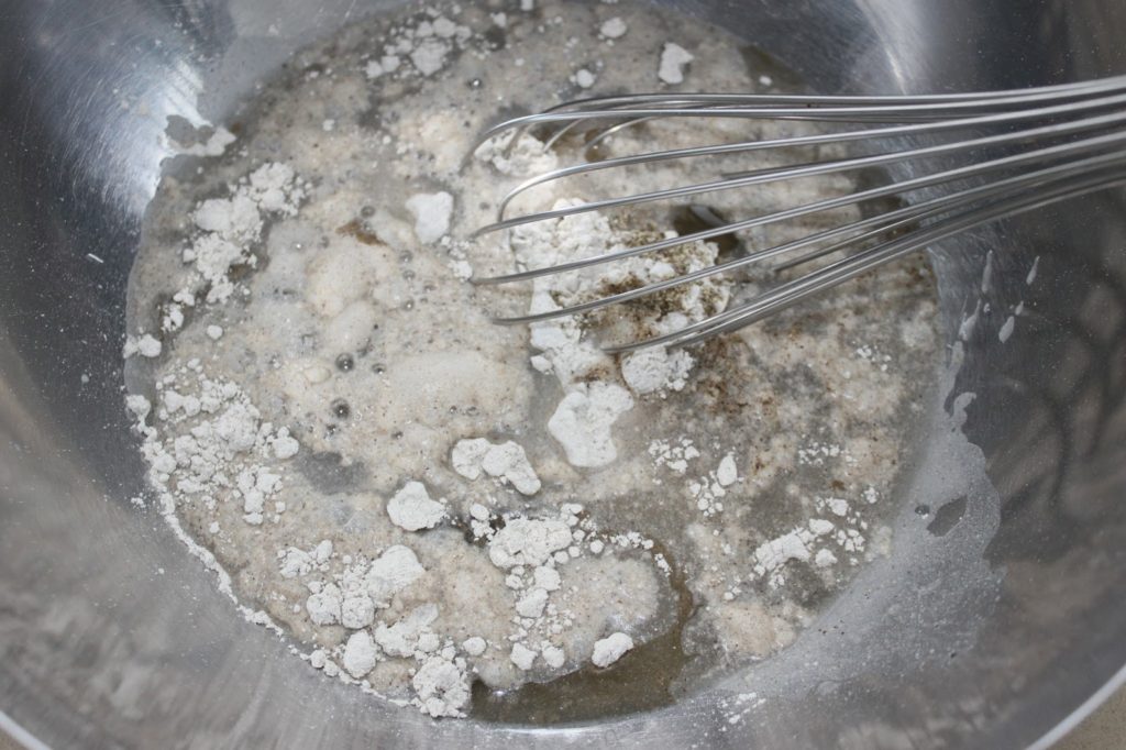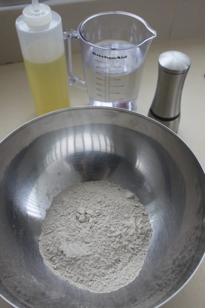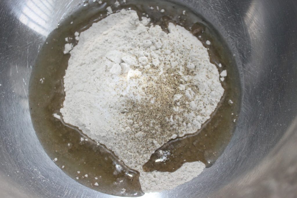 - Dans un récipient, versez la farine de sarrasin, l’huile, le sel et le poivre. L’huile est en quantité importante, mais c’est ce qui va donner des « chips » délicieusement craquantes.