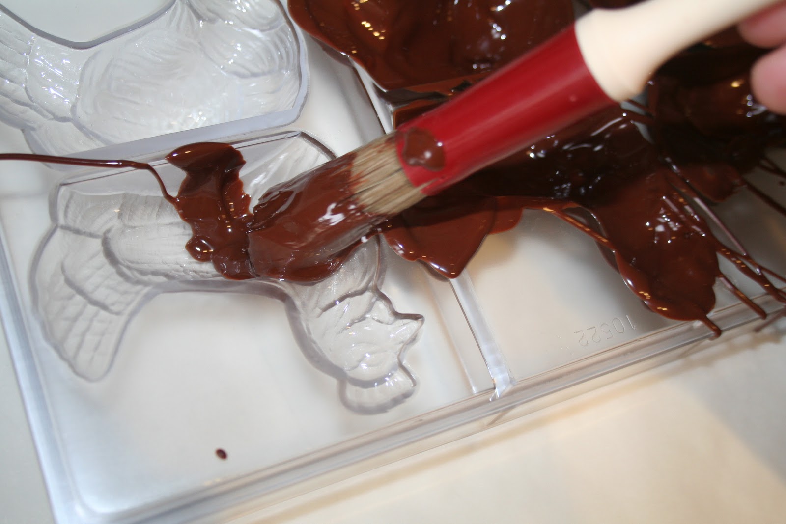 - Quand la couverture continue de refroidir, l’utiliser à 31-32°C.Sur la photo j’ai uilisé un pinceau pour remplir les moules. Les professionnels y vont à la louche puis laisse s’ecouler l’excédent à l’envers sur une grille. A la maison pour des raisons pratiques j’y vais donc avec un pinceau, cela donnera un chocolat très fin et bien réparti dans le moule sans faire trop de dégats dans la cuisine!!