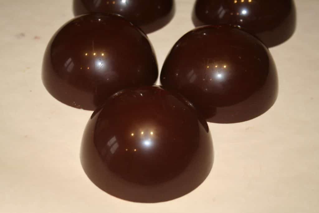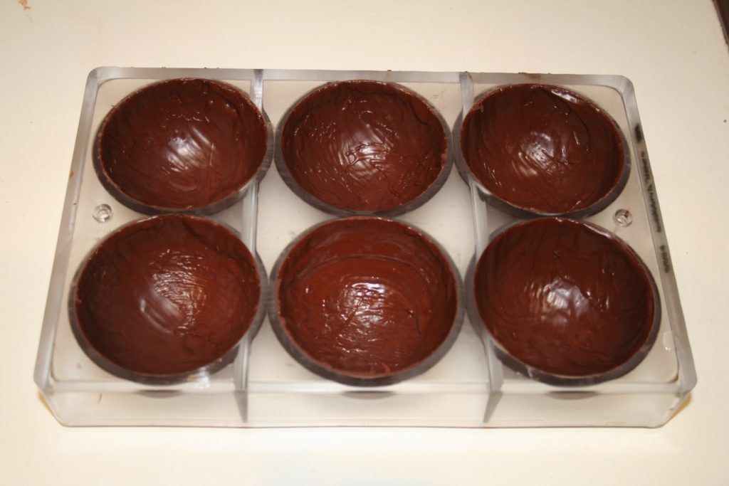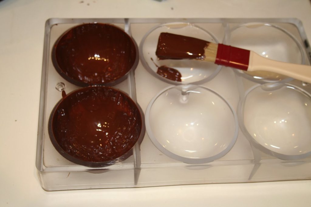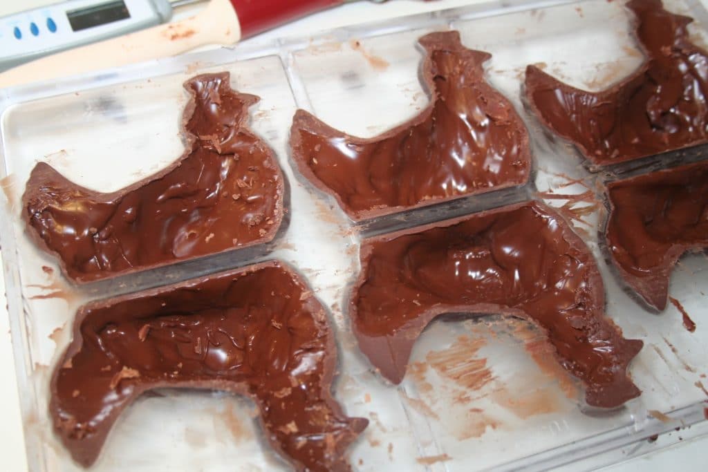 Sur la photo j’ai uilisé un pinceau pour remplir les moules. Les professionnels y vont à la louche puis laisse s’ecouler l’excédent à l’envers sur une grille. A la maison pour des raisons pratiques j’y vais donc avec un pinceau, cela donnera un chocolat très fin et bien réparti dans le moule sans faire trop de dégats dans la cuisine!!