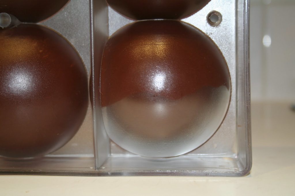 Sur cette photo on voit à l’envers du moule, la couverture qui a commencé à cristalliser et à se détacher du moule. On entend même de très près le chocolat se rétracter, un peu comme des rice krispies!!