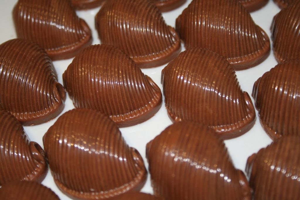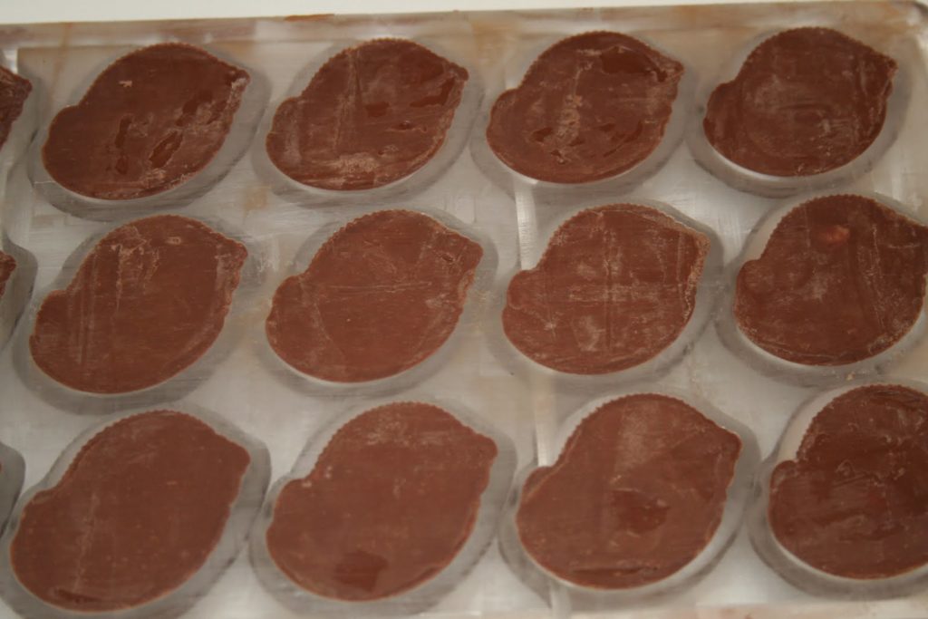 - Mettre une première couche de couverture lait dans les moules choisis (nettoyés avec un coton) avec un pinceau. Si on décide de ne pas mettre le chocolat au pinceau et plutôt à la louche, il faut renverser le moule à l’envers au-dessus d’un papier sulfurisé pour enlever l’excédent! Quand le chocolat cristallise, appliquer une deuxième couche.