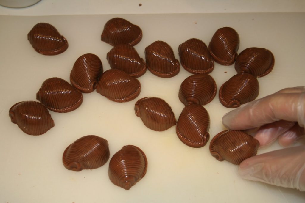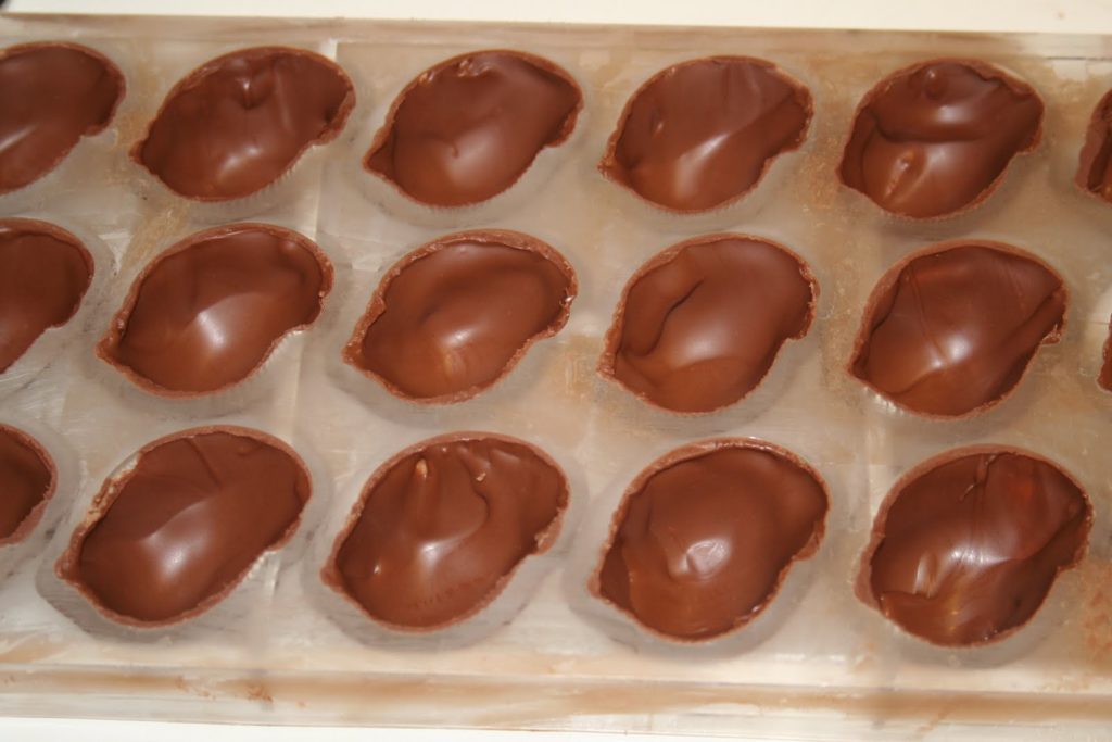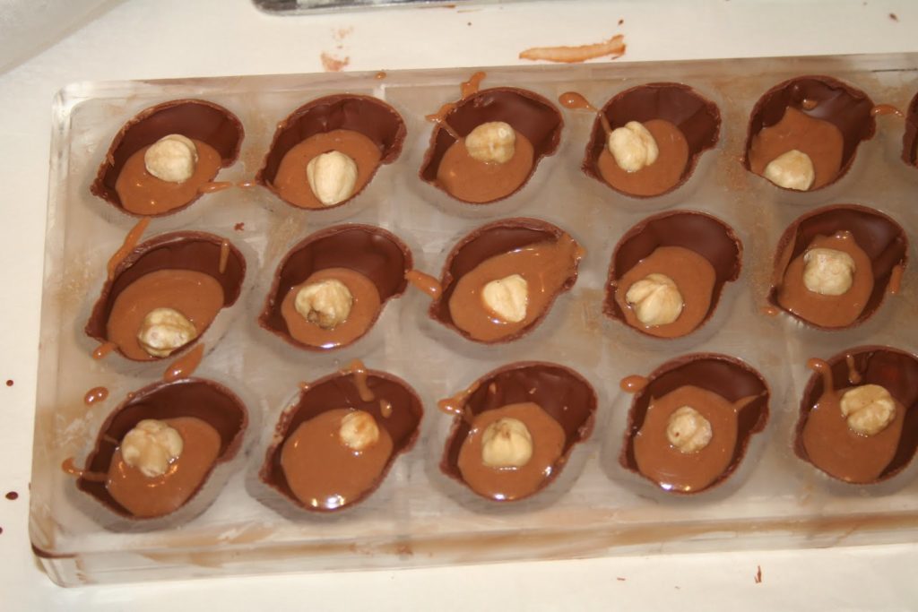 - Mettre une petite quantité de gianduja (quand celui-ci est à température ambiante) au fond des coques de chocolat. Mettre une noisette dans chaque coque .Mettre une deuxième couche de gianduja jusqu’à 1mm du bord. Laisser cristalliser, puis appliquer une couche de couverture lait. Quand le chocolat commence à cristalliser, racler le surplus avec un couteau à chocolat ou un couteau classique.