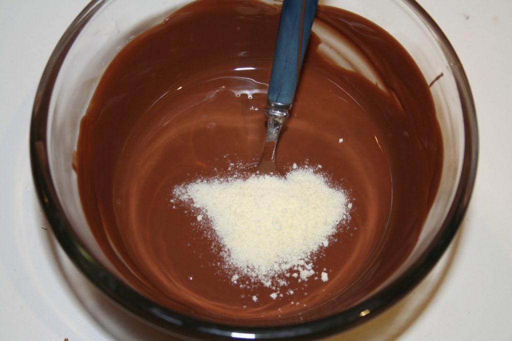Tout d’abord il vaut mieux revoir la méthode du tempérage du chocolat en cliquant ici. Je rappelle que je ne donne que des bases pour obtenir un beau chocolat à la maison avec la méthode mycryo. Je pense que cette méthode est accessible à tous alors que le vrai tempérage, le tablage (etc…) sont vraiment du domaine des chocolatiers. Chez nous, ni laboratoire, ni cuve de tempérage, juste un bol et de la poudre magique!