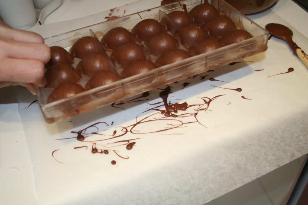 Mettre une première couche de couverture lait dans les moules choisis (nettoyés avec un coton) avec un pinceau. Si on décide de ne pas mettre le choloat au pinceau et plutôt à la louche, il faut renverser le moule à l’envers au dessus d’un papier sulfurisé pour enlever l’excédent! Quand le chocolat cristallise, appliquer une deuxième couche.