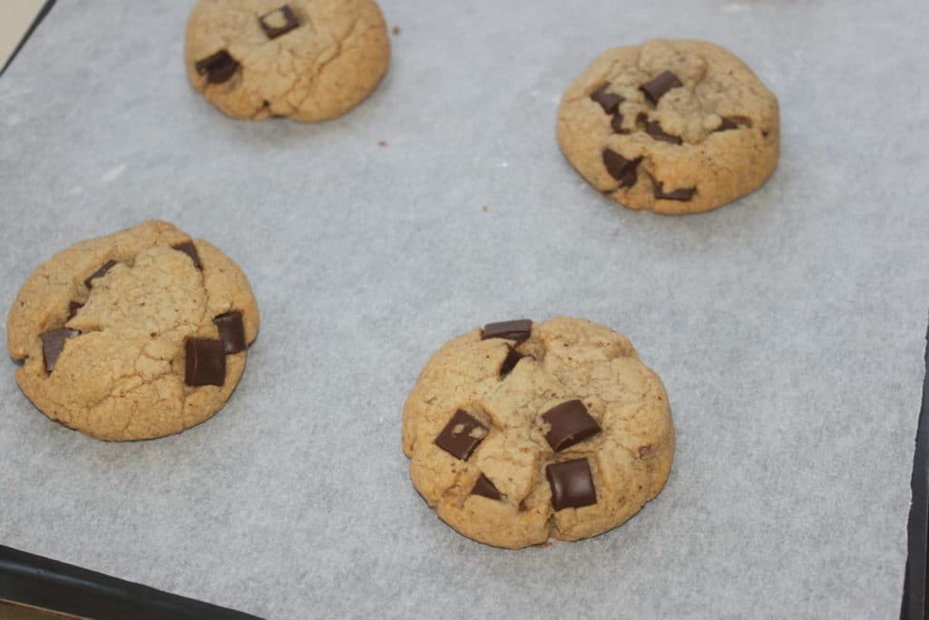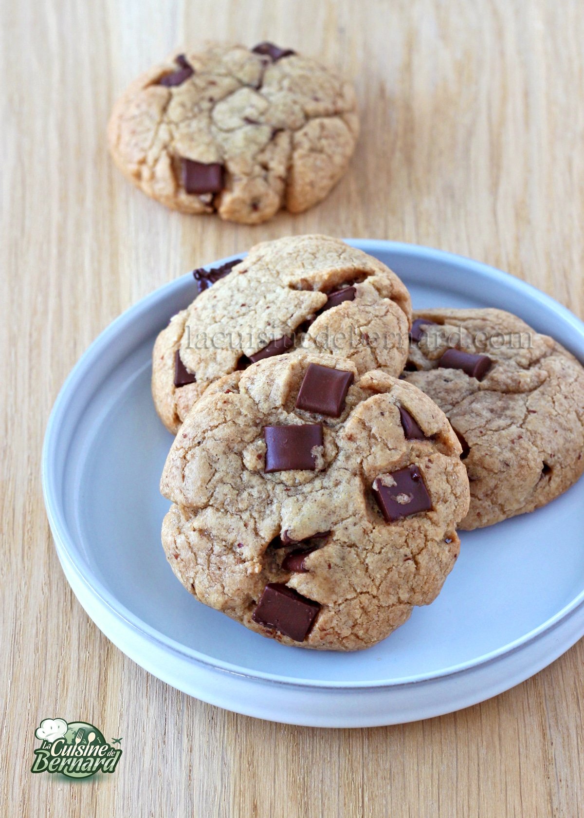 Ces cookies ont un goût totalement étonnant et addictif ! J’y mets dedans, du beurre noisette, c’est à dire un beurre que je fais cuire jusqu’à avoir une belle couleur foncée, du café en poudre, de la poudre de noisette et enfin du chocolat noir. Le tout donne une saveur très particulière et inhabituelle, mais complètement cohérente. Ils sont prêts très rapidement, même si je laisse refroidir la pâte à un moment donné. À faire pour changer des cookies plus traditionnels !
