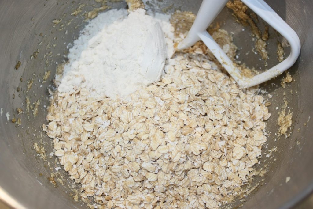 - Ajoutez la farine et les flocons d’avoine.