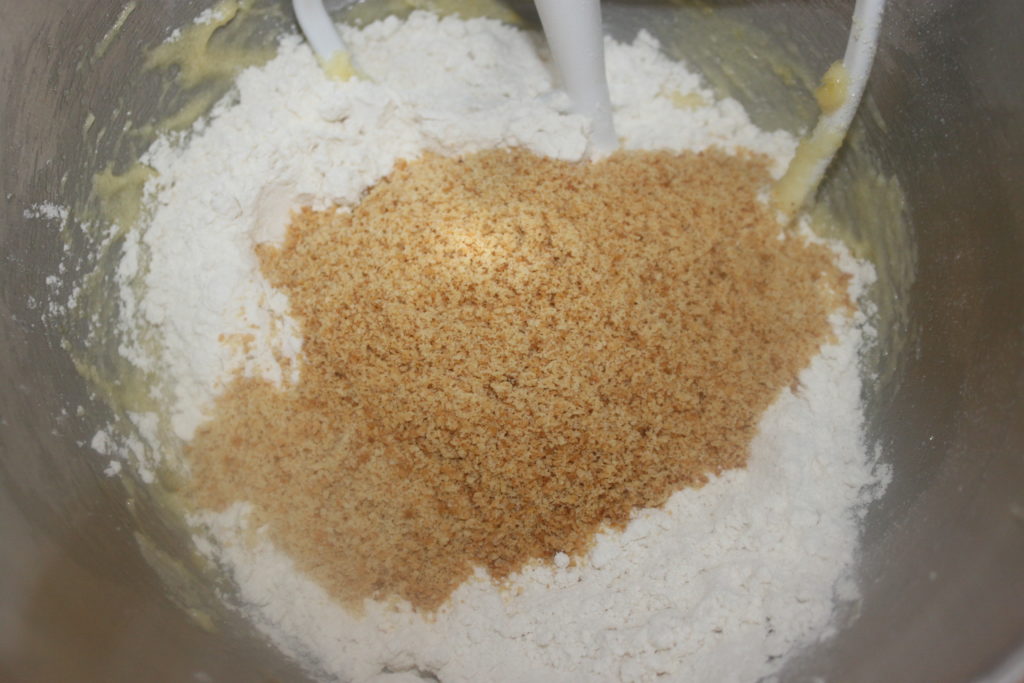 - Versez ensuite la farine et la poudre d'amande refroidie.