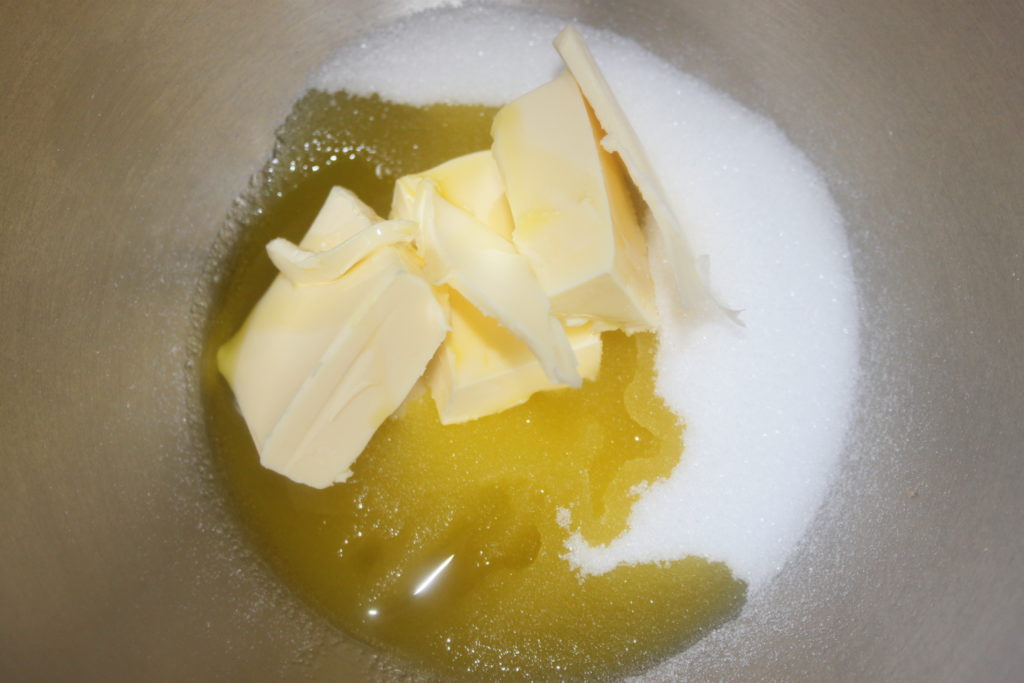 - Mettez le beurre, l'huile d'olive et le sucre dans un récipient. Si vous avez un robot, prenez la feuille.