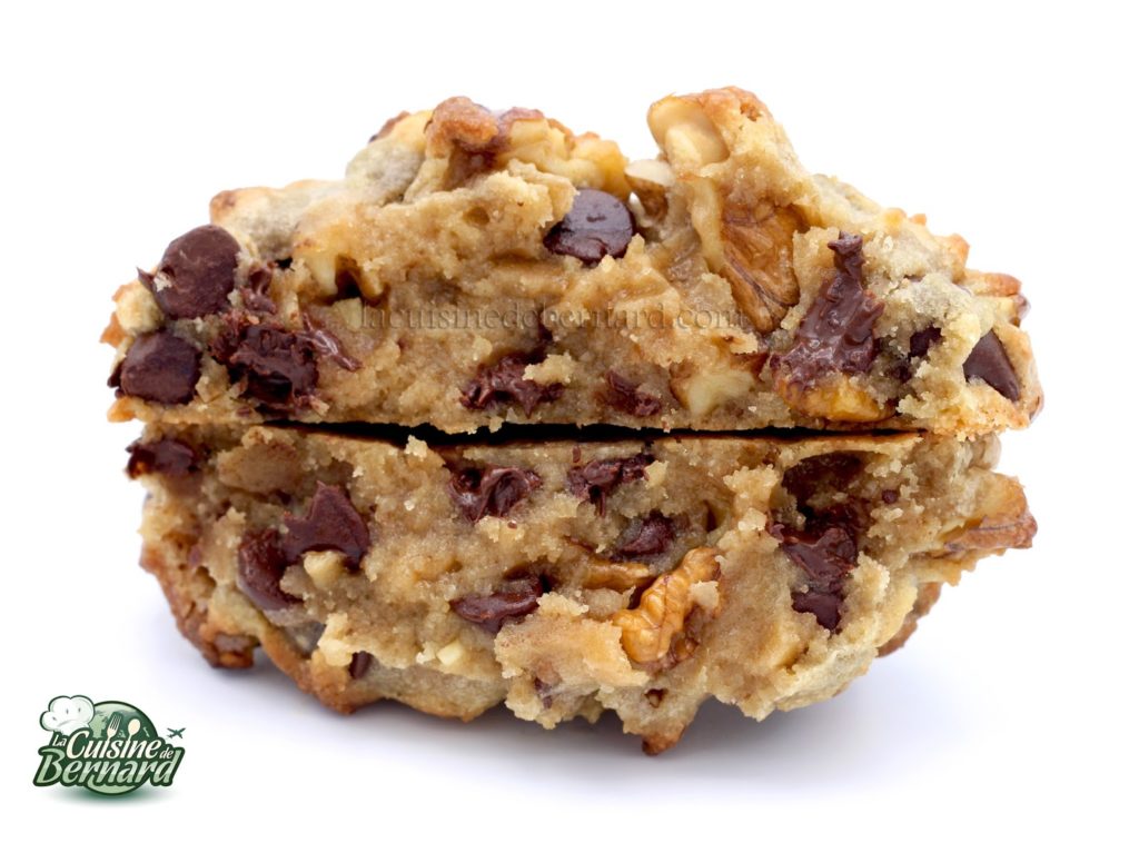 Note de Bernard: dans le pas à pas vous voyez des pépites de chocolat, alors que dans la photo du cookies vous pouvez voir des chunks. C’est que j’ai photographié les cookies qui ont été cuits pendant le direct et que j’ai refait le pas à pas avec des pépites (plus de chunks !) le lendemain.