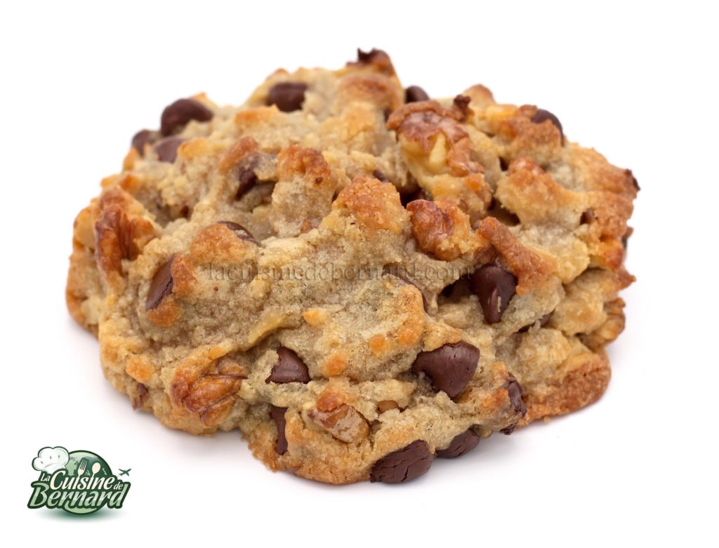 Il y a à New York, pas loin de Central Park, une pâtisserie qui propose des cookies géants, énormes, décadents ! Très réputés dans la ville, je les ai bien sûr goûtés et je les ai tant appréciés que j’en ai même rapportés plusieurs à la maison. Je me suis alors attelé à reproduire la recette et j’ai fait de nombreux essais pour arriver au plus près du résultat escompté. Ces cookies ont la particularité d’avoir un extérieur très croustillant et un intérieur bien moelleux avec des pépites encore fondantes. Généralement, les cookies sont soit fondants, soit comme des gâteaux plus secs ou alors s’ils ont les deux qualificatifs à la fois, c’est parce qu’ils sortent du four. Mais bien souvent, 1 heure après, ils se ramollissent légèrement pour avoir une texture plus tendre. Cette variante XXL que je vous propose ici conserve parfaitement ce contraste entre la croûte craquante et le cœur fondant. Si vous pensez que c’est une erreur de ne mettre ni de levure chimique ni de bicarbonate de sodium, je vous rassure tout de suite, ce n’est pas le cas. C’est exprès pour que les cookies gardent au maximum leur forme de départ. La pâte ne va pas s’aérer et c’est grâce aussi à cela que nous sommes ici à cheval entre un cookie classique et un gâteau croustillant. Recette tirée de mon premier livre « Les desserts de Bernard » chez Flammarion.