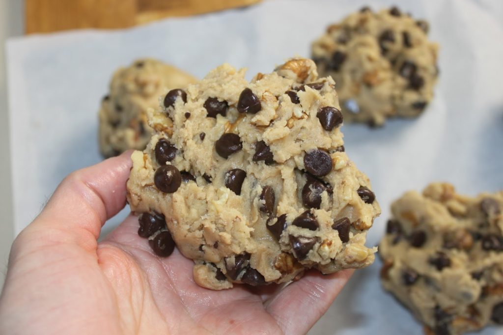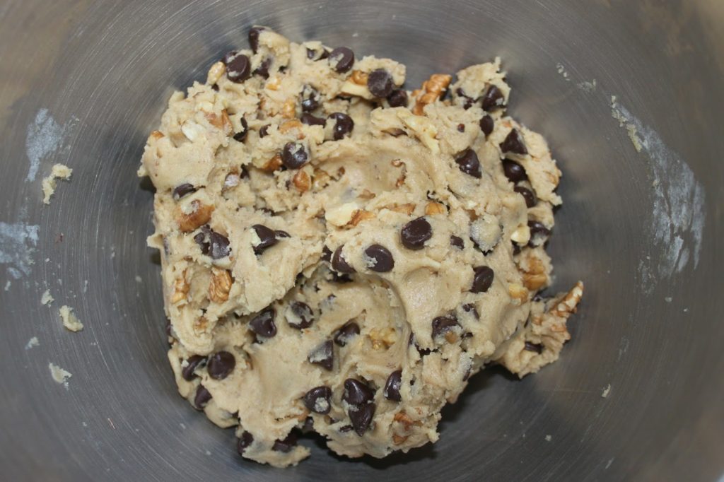 de pétrir à la main pour parfaitement répartir les noix et le chocolat.
