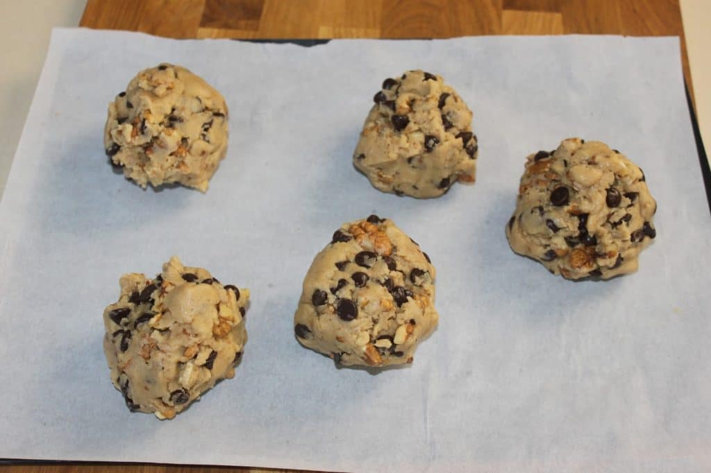 - Pour des cookies vraiment décadents, divisez la pâte en cinq boules de même poids, c’est-à-dire 185 g. Vous pourrez bien sûr en faire de plus petits, mais c’est grâce à leur taille assez exceptionnelle que les cookies gardent un vrai moelleux à l’intérieur et une croûte craquante.