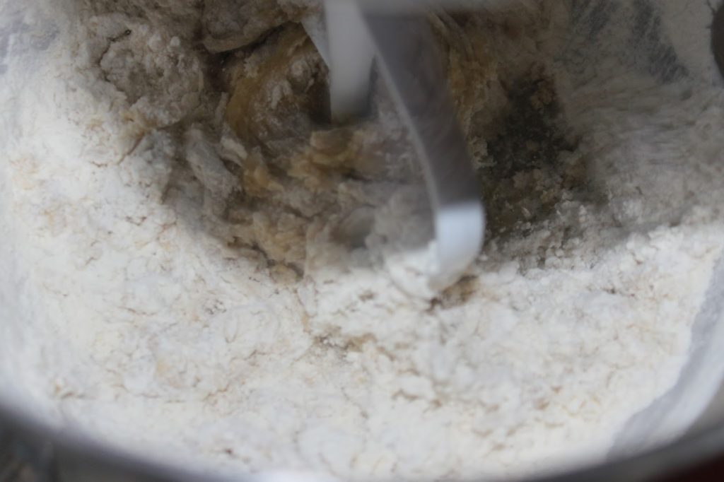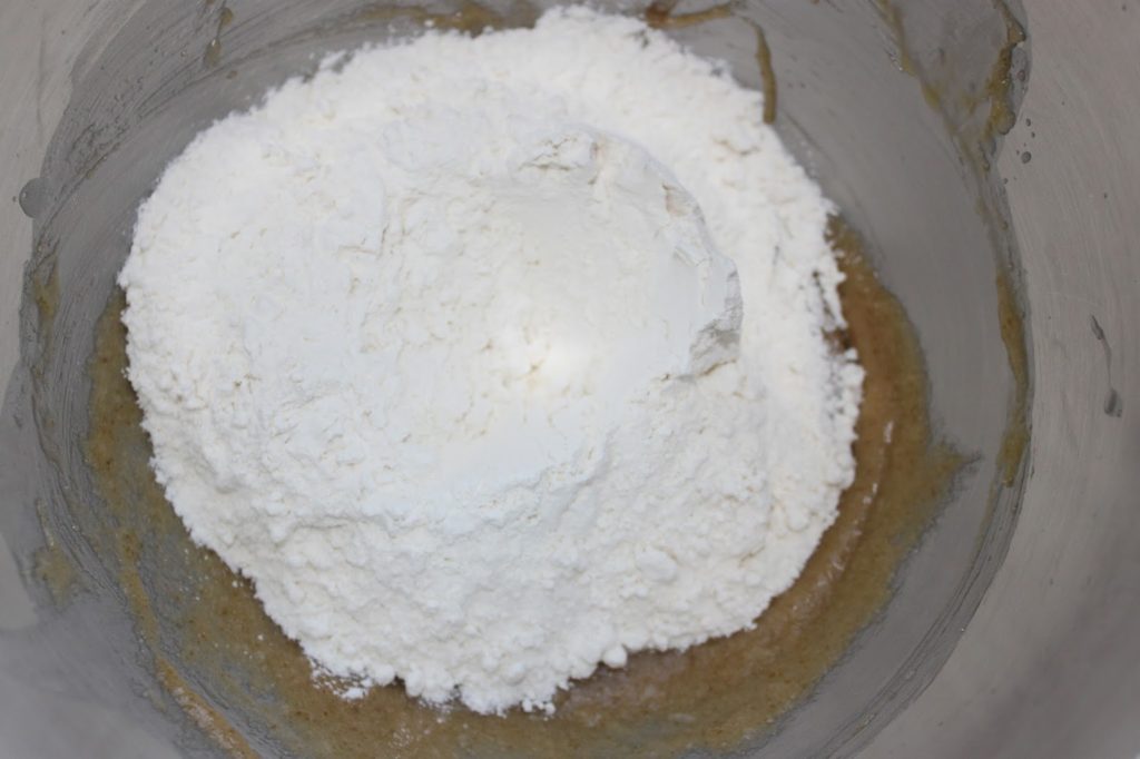 - Versez ensuite la farine d’un seul coup et malaxez pour l’incorporer totalement.