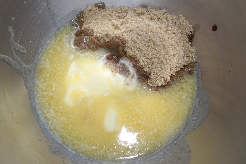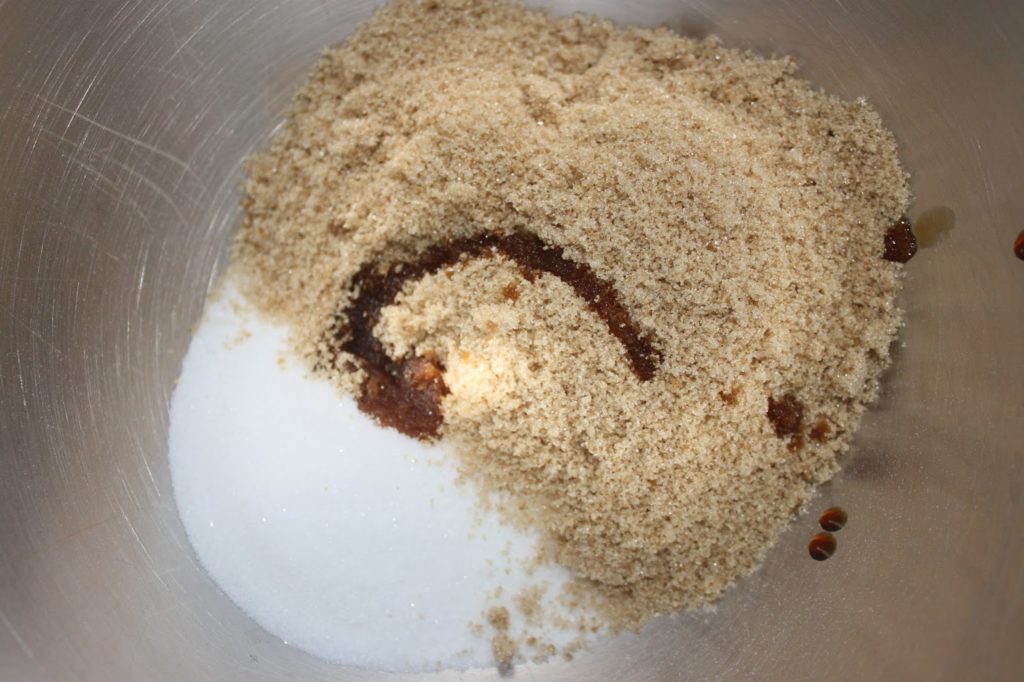 - Dans un grand bol ou la cuve d’un robot, mélangez le sucre semoule, la vanille liquide et la vergeoise blonde.