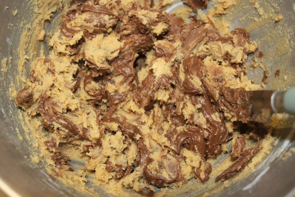 Mélangez succinctement avec un couteau pour ne pas incorporer la pâte à tartiner dans la pâte à cookies. Sinon vous risquez d’avoir une pâte mélangée.