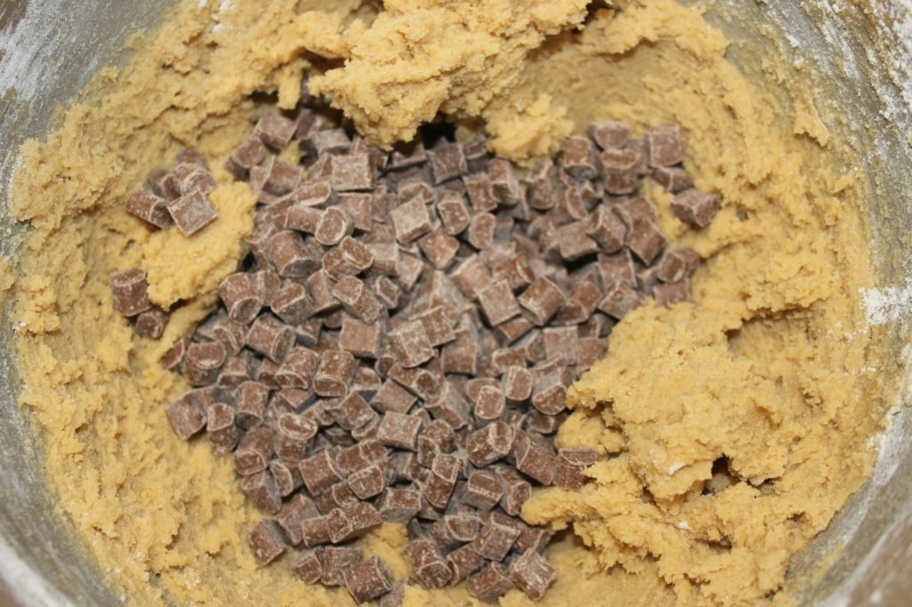Pétrissez pour avoir une pâte homogène puis ajoutez les pépites (ou des chunks comme ici) de chocolat au lait.