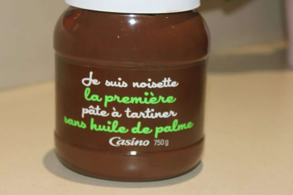 - Voici la pâte à tartiner sans huile de palme que j’ai achetée. Je l’ai trouvée chez Casino, on en trouve sans doute d’autres marques qui sont sans doute encore meilleures.