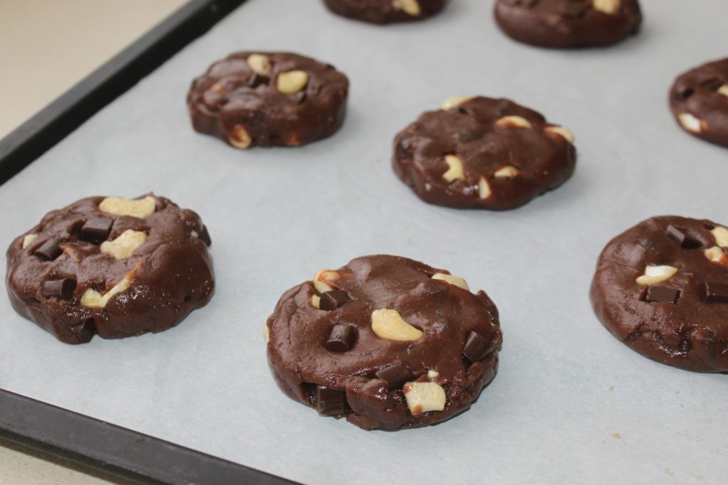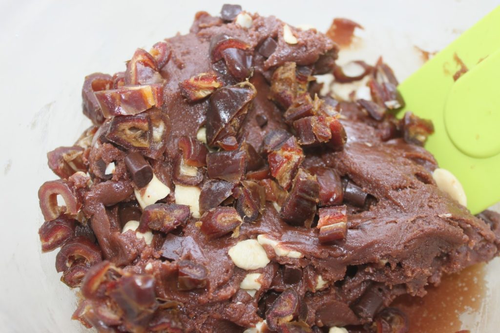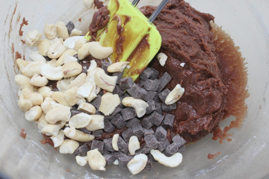 - Mélangez et ajoutez les pépites de chocolat et les noix de cajou crues cassées en morceaux.