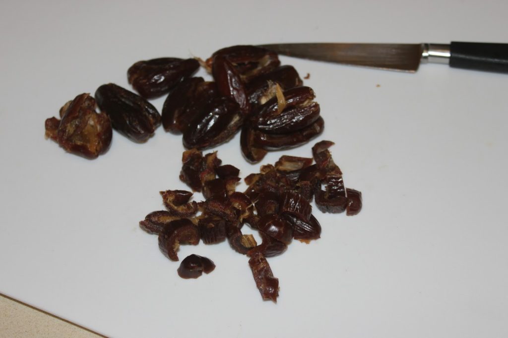 - Dénoyautez les dattes et coupez-les en morceaux.