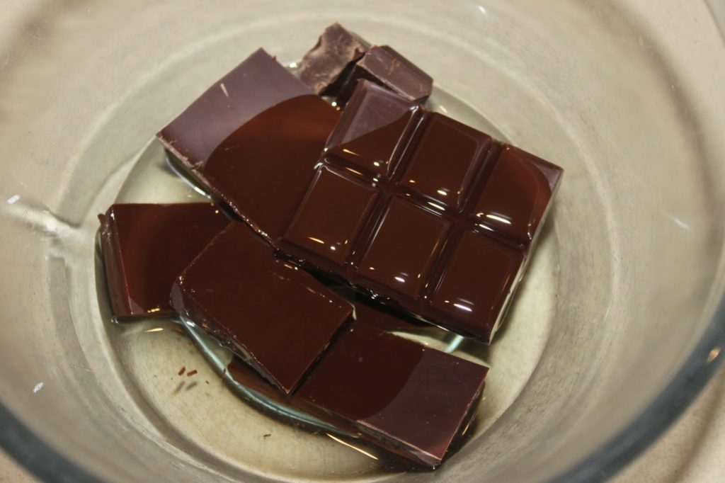 - Placez le chocolat avec l’huile et faites chauffer une minute au four ) micro-ondes ou au bain-marie.