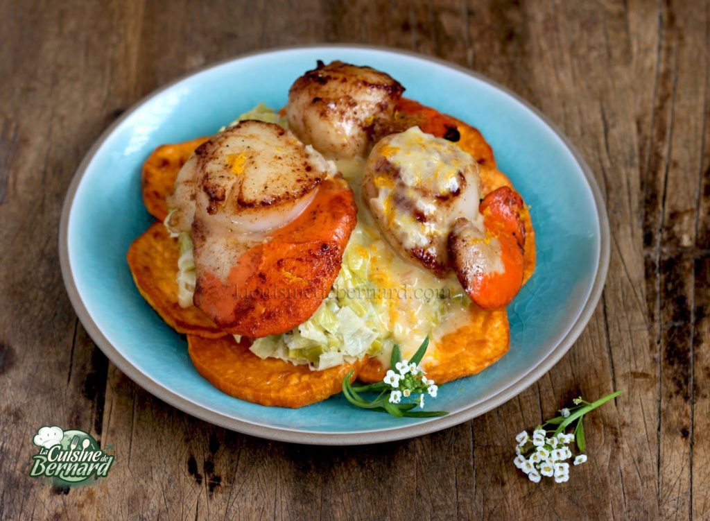 - Dressez les assiettes en faisant une rosace de patate douce. Placez un tas de poireaux crémeux puis les coquilles Saint Jacques. Arrosez à votre convenance de beurre blanc à l’orange et dégustez sans attendre !