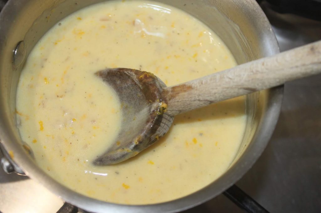 Quand tout le beurre est ajouté, versez une cuillerée à soupe de crème liquide entière pour bloquer la sauce et l’empêcher de trancher.