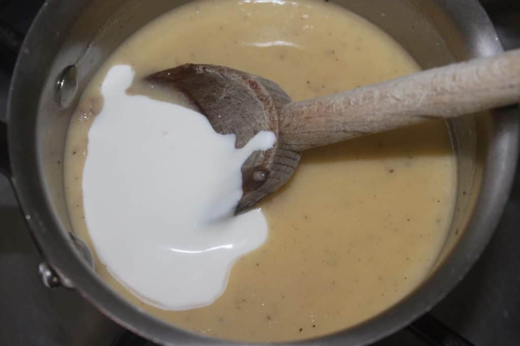 - Quand tout le beurre est ajouté, versez une cuillerée à soupe de crème liquide entière pour bloquer la sauce et l’empêcher de trancher.