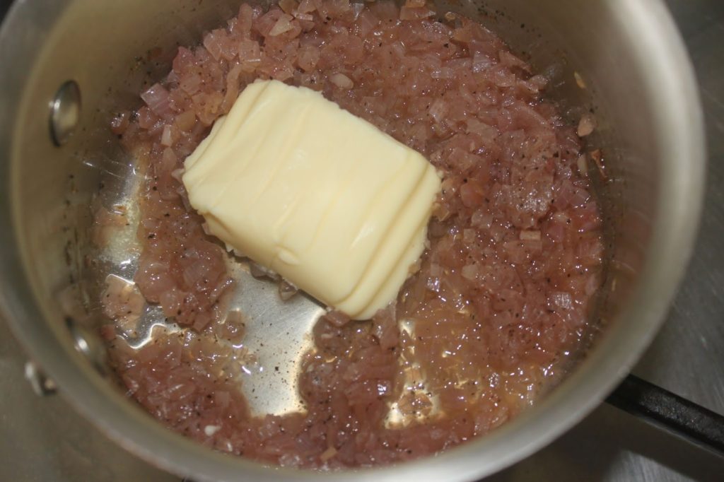 - Ajoutez alors le beurre salé en 4 ou 5 fois, sur feu doux. Le premier morceau doit bien fondre avant d’ajouter la suite. Je garde ici les échalotes, je trouve dommage de les enlever comme dans beaucoup de beurre blanc.