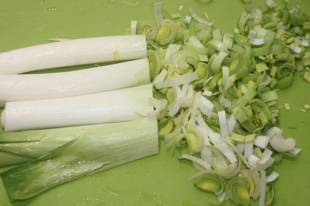 - Enlevez une partie du vert et les racines. Assurez vous de l’absence de terre dans la partie verte restante. Coupez en deux dans la longueur puis coupez-les finement.