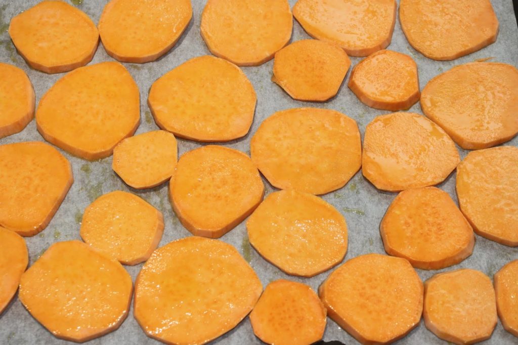 - Placez-les sur un papier cuisson sur une plaque de cuisson. Passez de l’huile d’olive au pinceau des deux côtés des tranches.