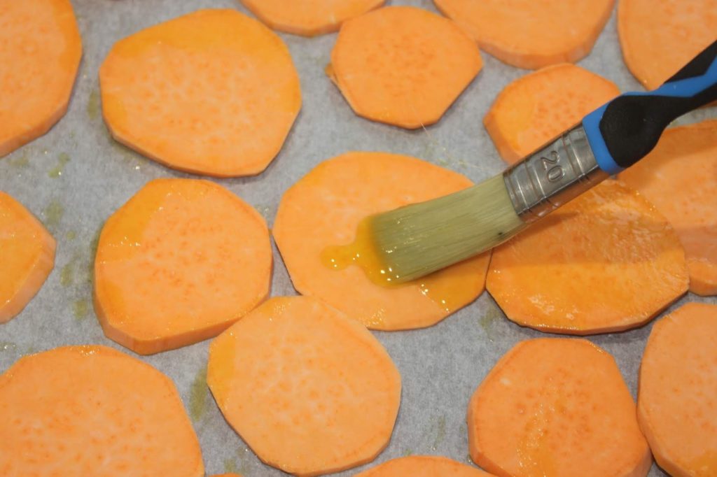Placez-les sur un papier cuisson sur une plaque de cuisson. Passez de l’huile d’olive au pinceau des deux côtés des tranches.