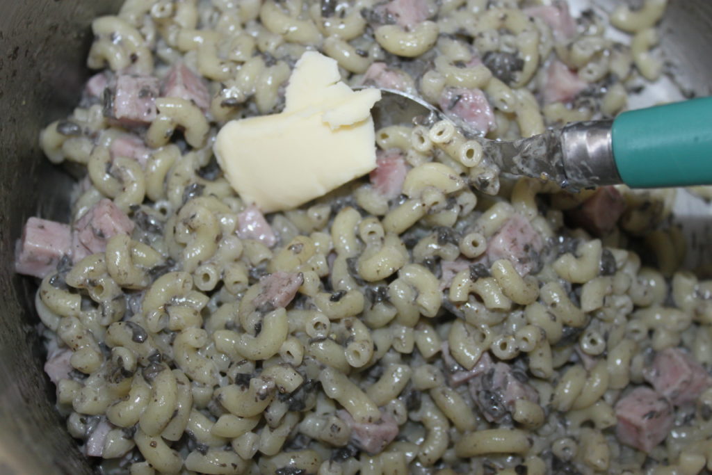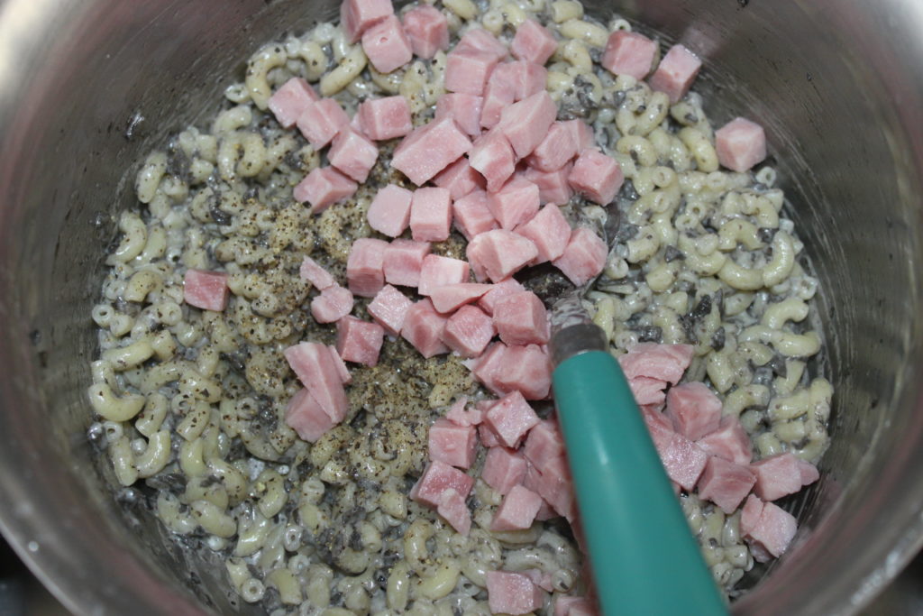 - Mélangez bien, ajoutez le jambon et le beurre.