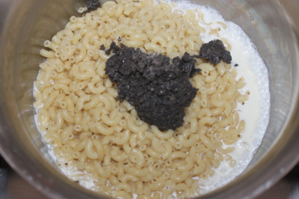 - Quand les coquillettes sont prêtes, remettez dans la casserole sur feu doux avec la crème et la tartufata.