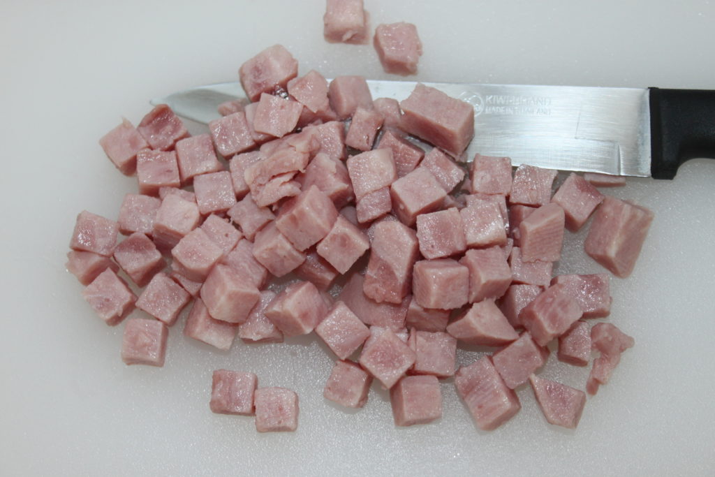 - Prenez du jambon en tranches épaisses pour pourvoir faire des petits cubes.
