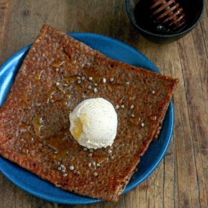 - La crêpe va devenir croustillante. Faites cuire de l’autre côté puis servez sans attendre avec une boule de crème glacée, un peu de miel de sarrasin et du sarrasin grillé.