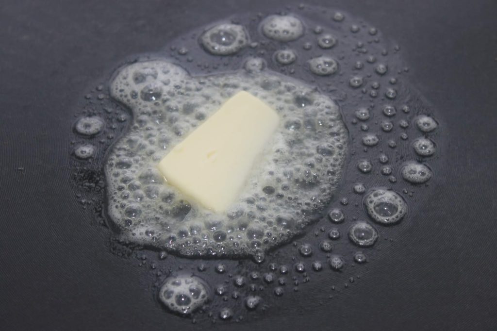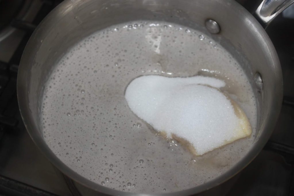 - Versez le beurre demi-sel et la moitié du sucre (90g du coup) puis faites chauffer (pas bouillir cette fois).
