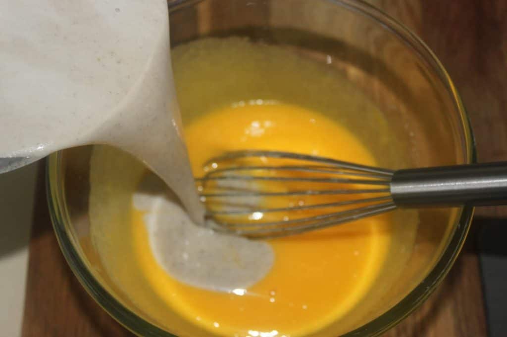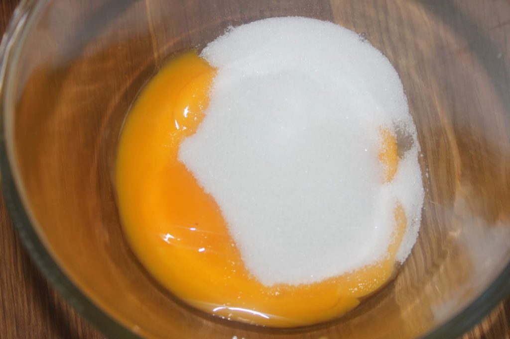 - Versez dans un récipient l’autre moitié du sucre et les 80g de jaune. Mélangez bien.