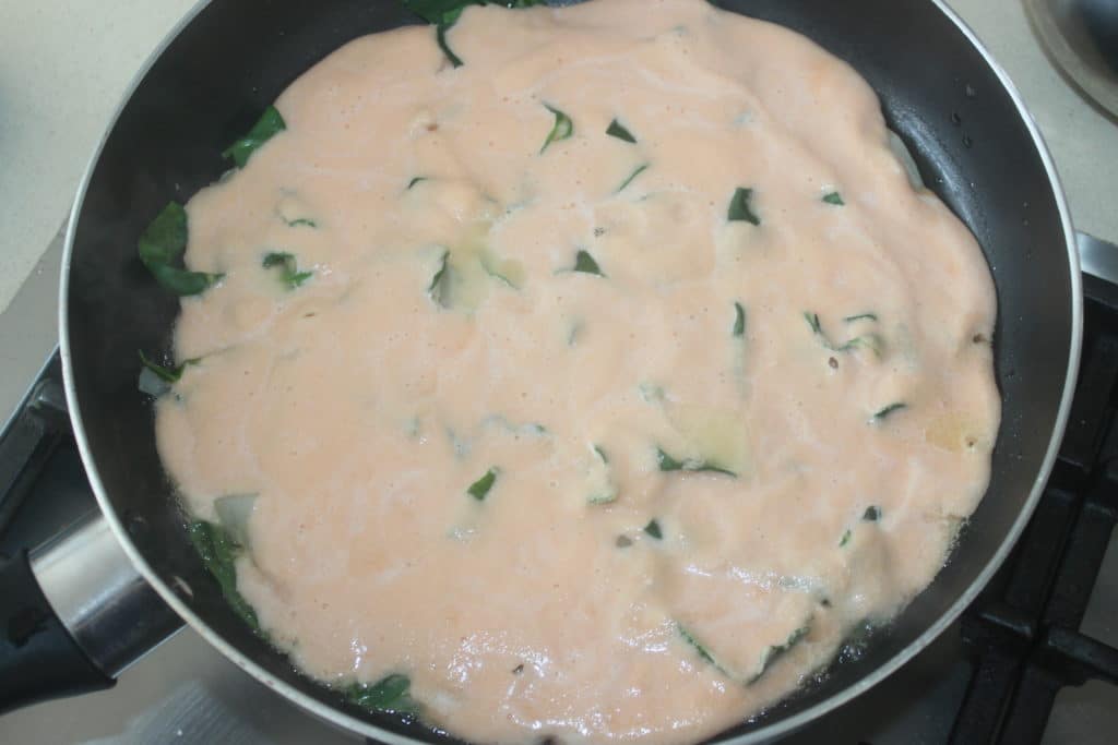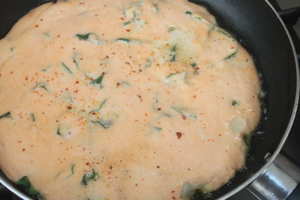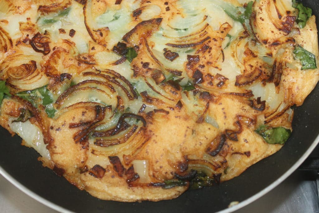 - Ne remuez pas les oignons. Laissez-les se colorer puis recouvrez avec des morceaux de blettes. Il ne faut pas qu’il y ait trop de légumes en même temps, sinon on aura une crêpe trop épaisse. Et plus elle sera fine, plus elles sera croustillante et délicieuse ! Versez ensuite de la pâte aux lentilles pour recouvrir les légumes. Le tout doit faire moins de 5mm.
