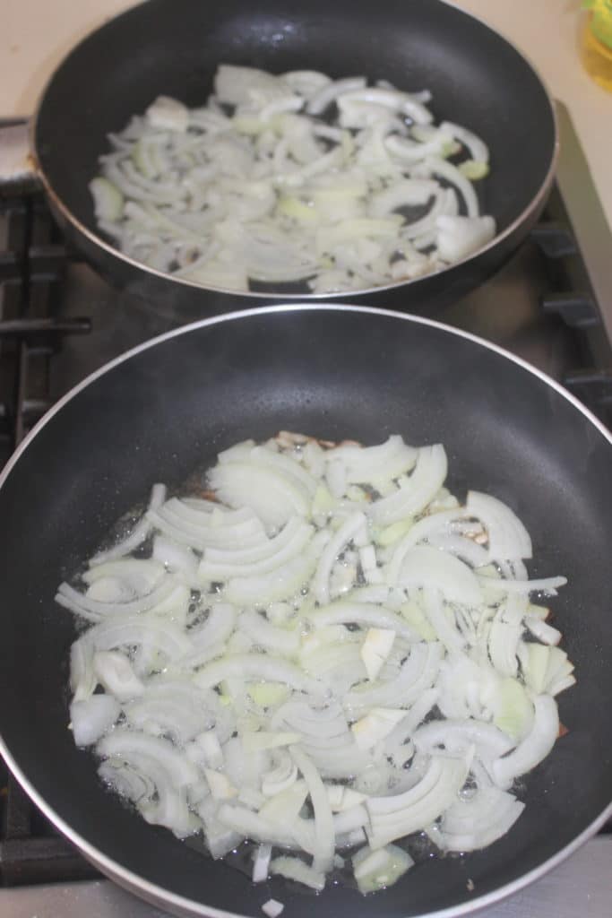 Pelar y picar la cebolla. Vierta 4-5 cucharadas de aceite en una sartén antiadherente. Tiene que ser graso para que el panqueque quede crujiente. Poner la cebolla en el fondo de la sartén. Lo he hecho en dos ollas pequeñas. Con una cebolla, una acelga y la masa, puedes hacer varias tortitas dependiendo del tamaño de tus sartenes.