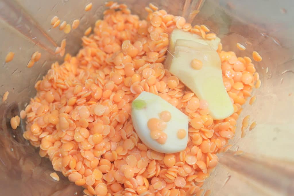 - Mettez les lentilles corail trempées et égouttées dans un blender ou un mixeur avec le gingembre, l’ail, du sel et les 330g d’eau.