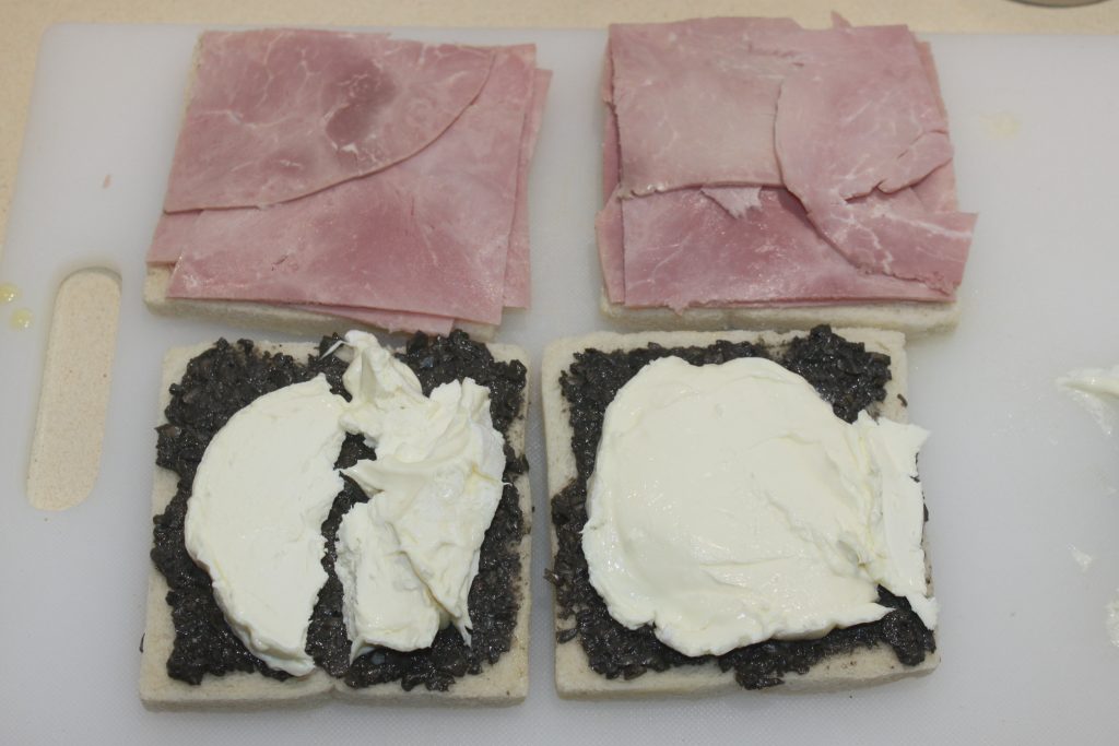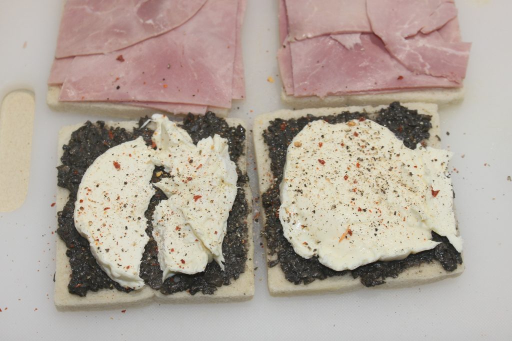 - Coupez les tranches de jambon (ici sans nitrite, même si je le trouve tout de même très rose ! ) en 4 puis mettez 2 tranches par croque, donc 8 quartiers, la coupure vers l’extérieur pour qu’il ne déborde pas. Mettez un bon morceau de Brillat-Savarin sur la tartufata.