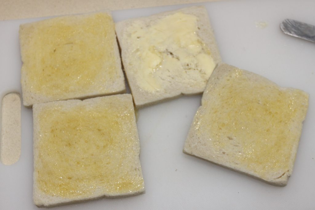 - Commencez par mettre du beurre demi-sel sur un côté des tranches de pain de mie. J’ai commencé avec du beurre mou puis beurre fondu.