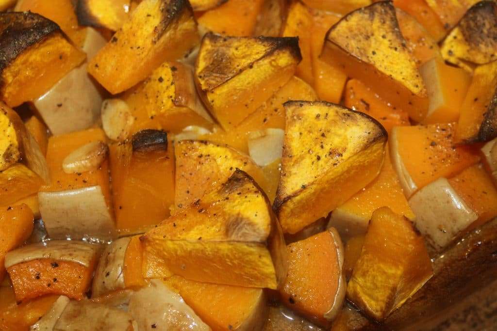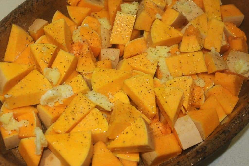 Faites de même pour la deuxième courge. Mettez tous les morceaux dans un plat à gratin. Salez, poivrez, mettez l’ail tranché, arrosez généreusement d’huile d’olive.