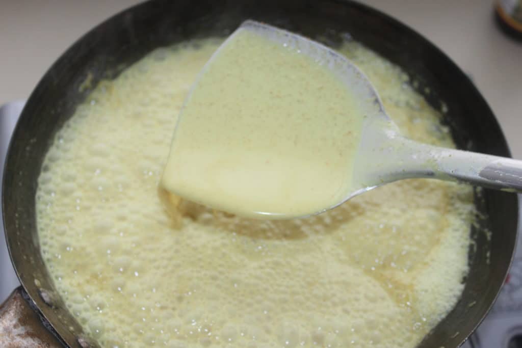 Yo lo hago en un wok pero se puede hacer en una sartén. Pesar el wok que contiene la leche de coco. Ya verás por qué. Dejar hervir y volver a pesar de vez en cuando. Debe perder un total de 150g desde el inicio de la operación. El agua de la leche de coco se evaporará. Pesando todo el wok al principio y durante la cocción, sabrá exactamente cuándo ha perdido los 150 g.